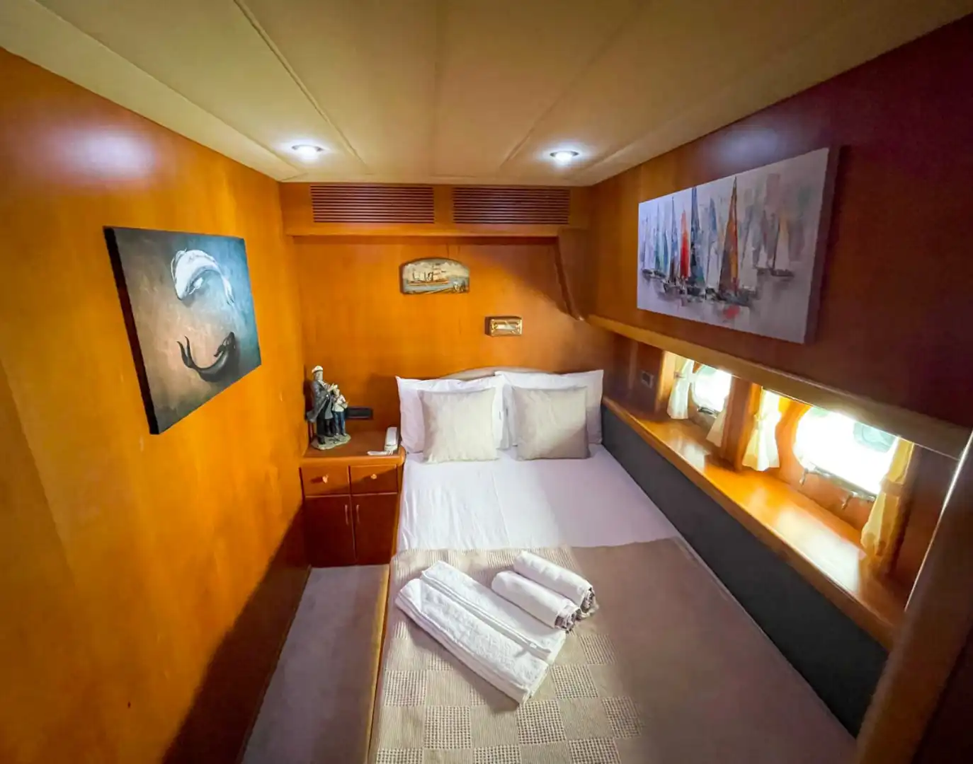 Sirocco can host up to 6 guests in 3 comfortable cabins: 1 Master, 1 Double, and 1 Twin. All cabins are air-conditioned and feature en-suite bathrooms. The interior salon offers a cozy seating area, IPTV, and seamless access to onboard Wi-Fi. Separate crew quarters ensure maximum privacy for guests.