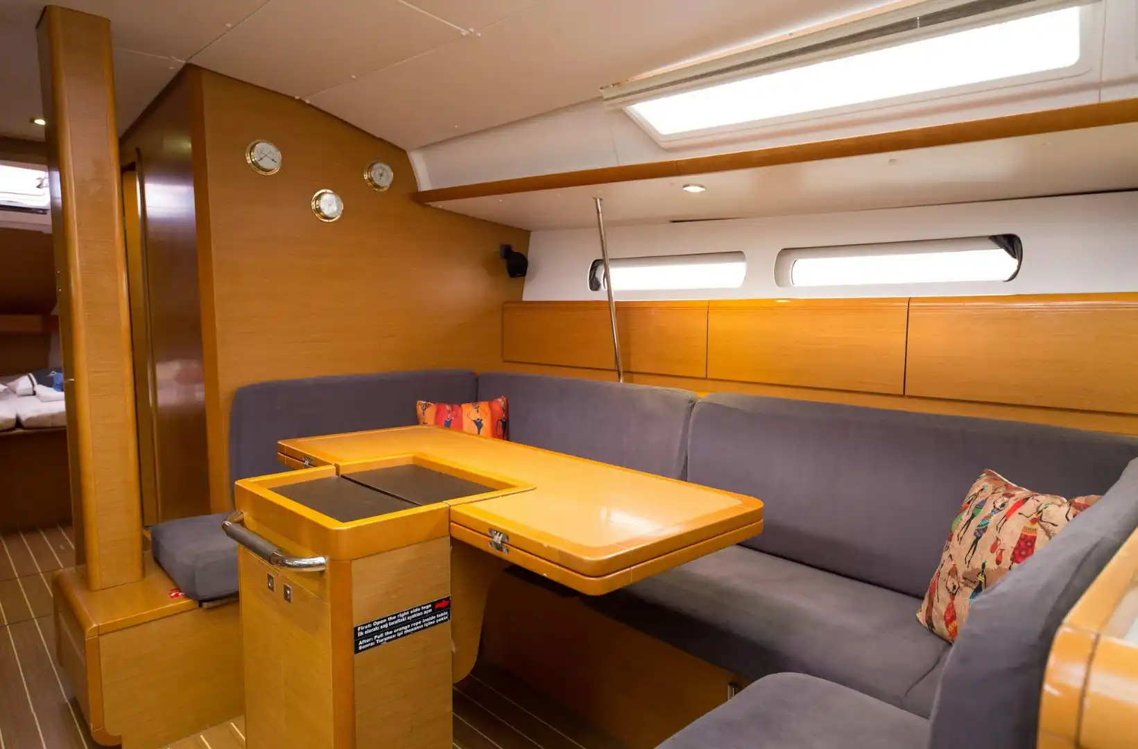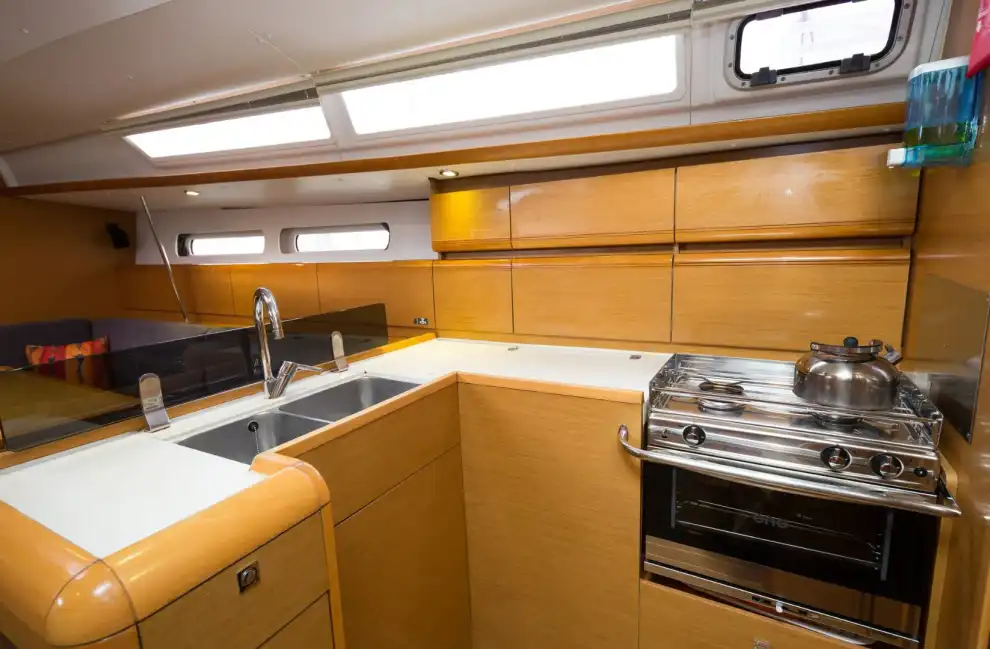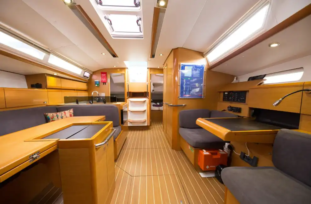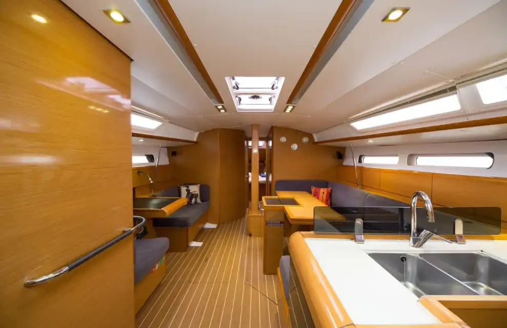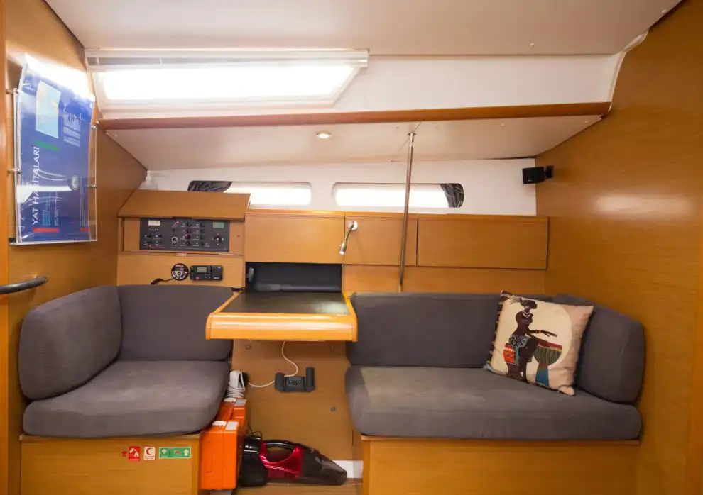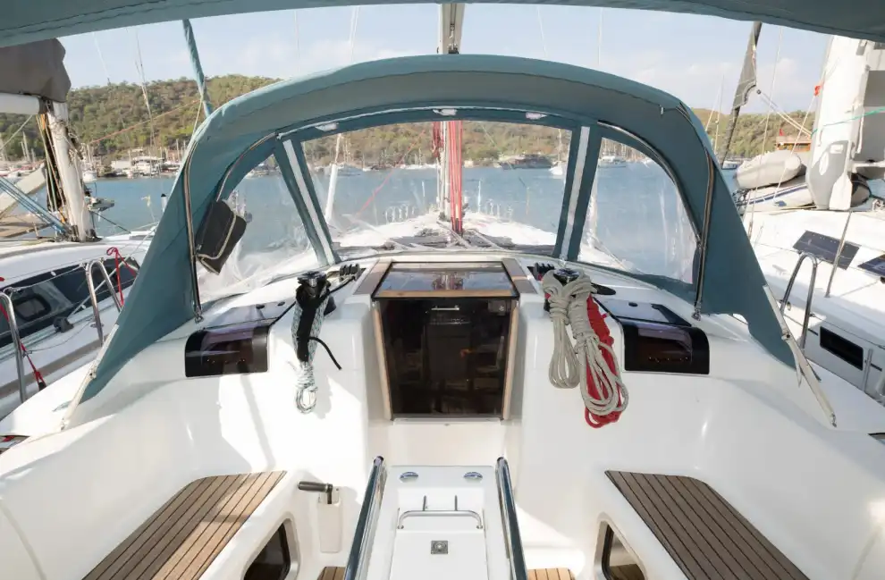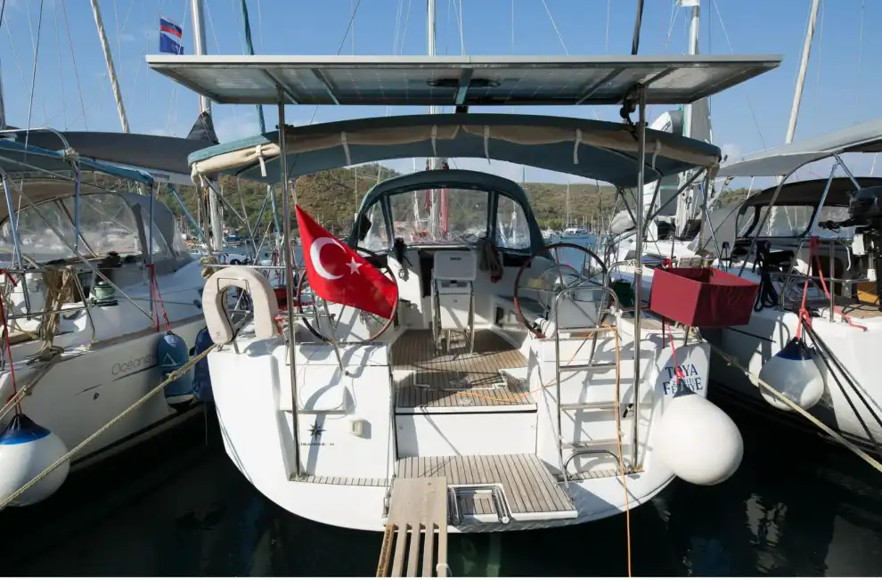 Teknede bulunan ılık su sistemi, güneş çadırı, güvertede duş, kokpit masası ve güvertedeki hoparlörler, Fethiye’nin güneşli günlerinde deniz keyfini zirveye taşır. Tender (dinghy) sayesinde koylara kolay erişim sağlanırken, ısıtma sistemi ve güvenlik ekipmanları ile her mevsime uygun bir kullanım sunar.